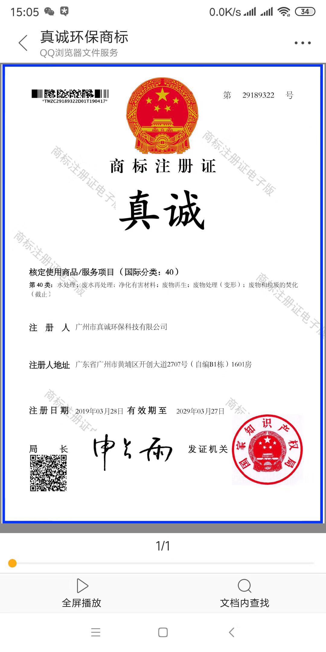 广州市真诚环保的“真诚”商标注册成功,“真诚”商标有效期是2029年3月27日。